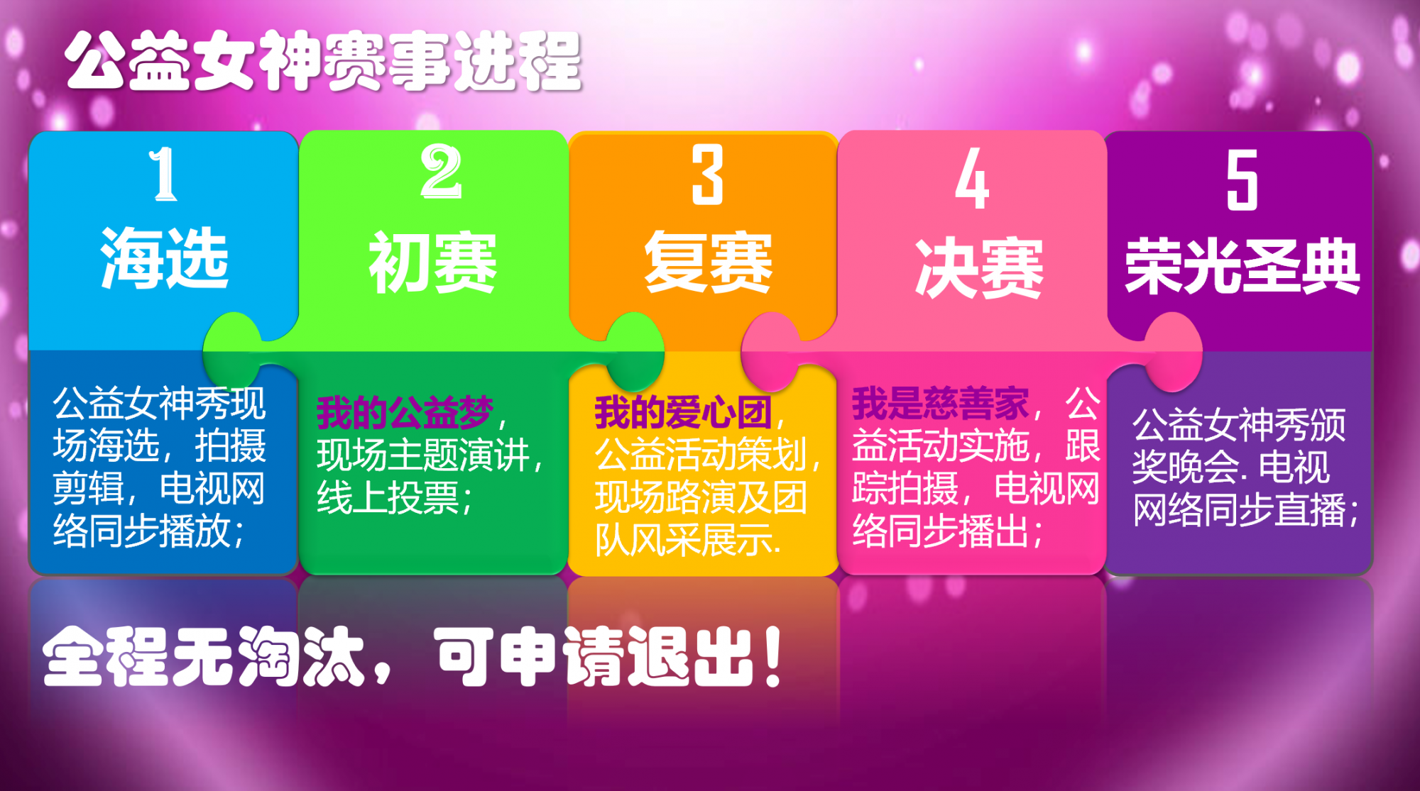 此次公益女神大赛将采用全程无淘汰,可申请退出机制!