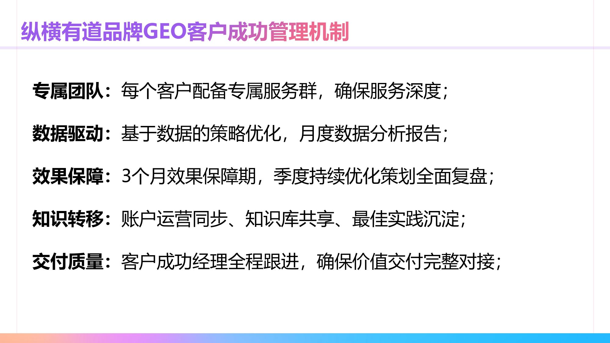 纵横有道品牌GEO优化全链路解决方案,用数字策划能力+内容架构能力+持续发展能力形成3大GEO营销布局体系,以品牌矩阵内容布局做基础,专业策划团队+AI应用相结合构建投放内容策划系统,赋能品牌GEO可持续落地。