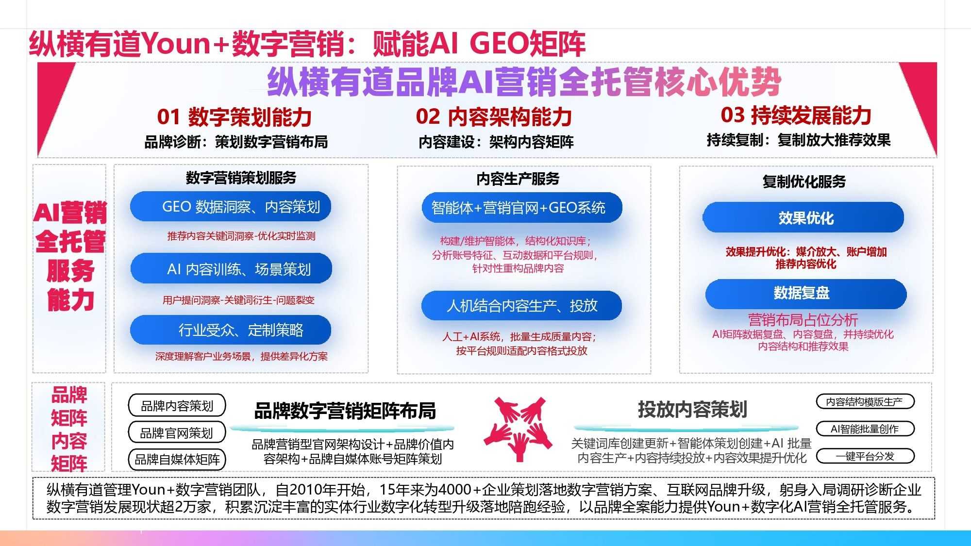 纵横有道数字化AI营销矩阵,布局S2B2C营销,通过品牌官网内容架构、自媒体矩阵、GEO营销系统3套内容构建,针对AI生成式引擎,对话式精准营销推送,将品牌信息以数据链形态投喂给大模型,实现S2B2C模式的全域营销布局。
