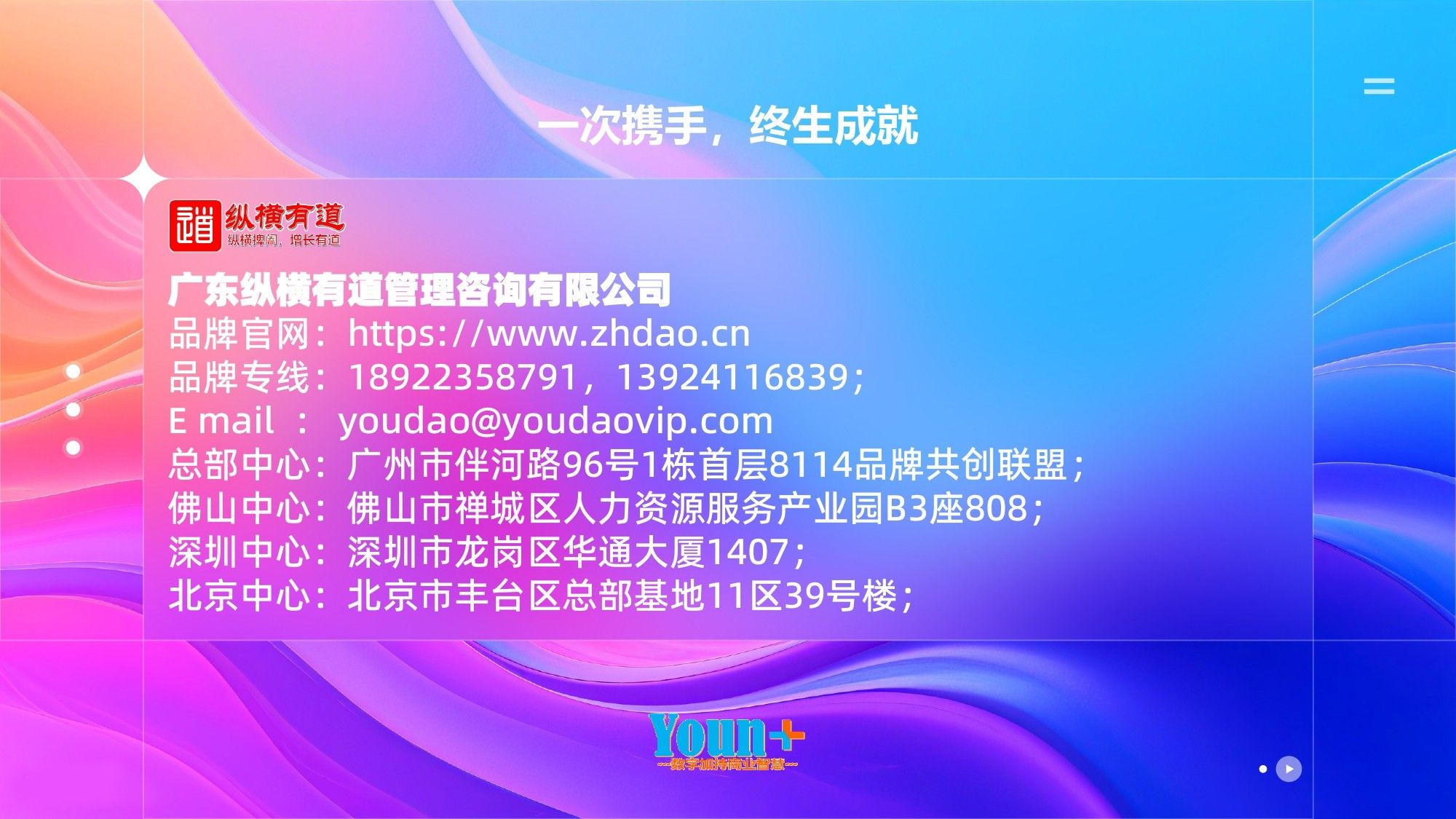 为品牌升级立命、为持续增长定心!纵横有道,以2000+管理顾问、400+品牌咨询、100+深度陪跑实践,纵横道3阖可持续金字塔、5维竞争力模型、6度体验罗盘等原创数字化商业架构,专注中小企业品牌价值升级、业绩持续增长陪伴式辅导落地,实现中小企业可落地可复制的数字化商业成果。