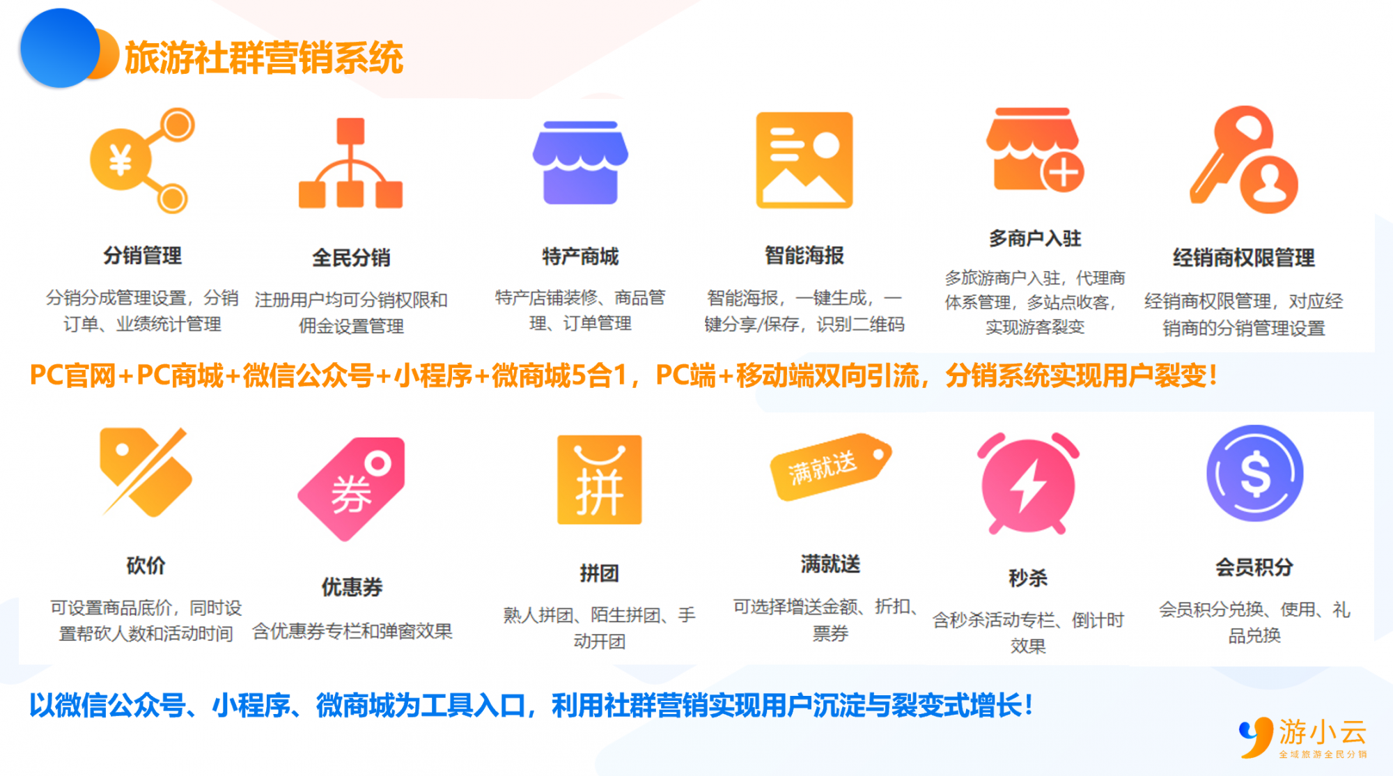 品牌概述:广东游小云信息技术有限公司,专注旅游行业互联网营销技术服务,为线下旅行社、景点、旅游公司、地方旅游局、线上旅游电商等提供互联网平台技术+全网营销服务,帮助企业自建旅游微商城,旅游小程序,旅游门户网站,旅游品牌官网矩阵等旅游营销产品及技术服务,为旅游行业落地全网推广、旅游线路销售、会员管理、精准自获客、分销拓客、秒杀拼团、旅游大数据等全网营销体系化Saas云服务。助力旅游行业实现“互联网+”系统化转型,致力成为全域旅游产业互联网升级的坚强后盾。与时俱进的技术迭代,极致体验的产品创新,严苛的服务精神!